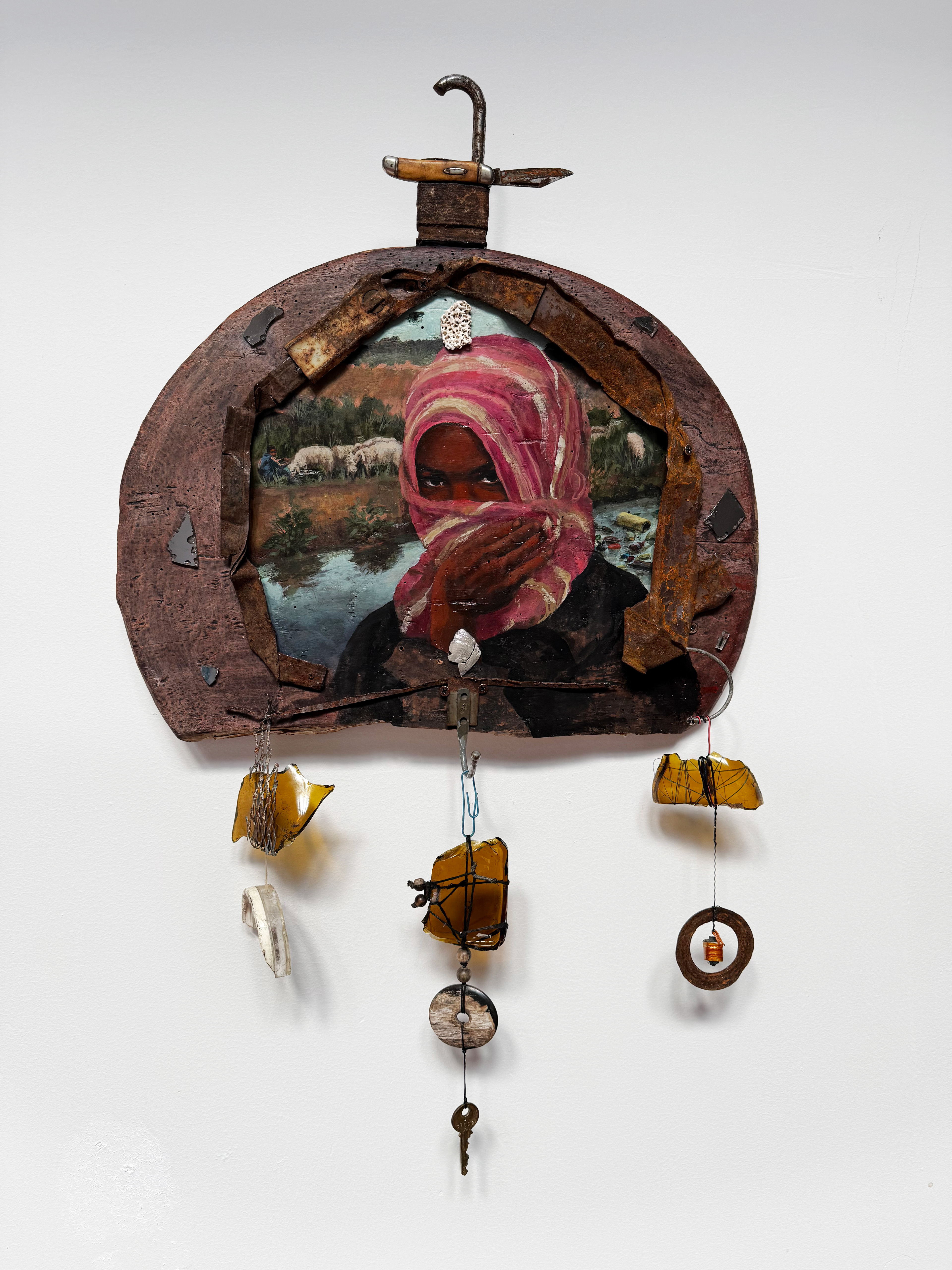Boot on the Neck of the River (The Last Martyr is the Water), 2025, Acrylic and found materials (wood, metal scraps, glass, paper clip, plastic, bottle cap, mirror shards, seashells, broken padlock, pocket knife, string, key, and other miscellaneous objects), 33” x 19” x 3”