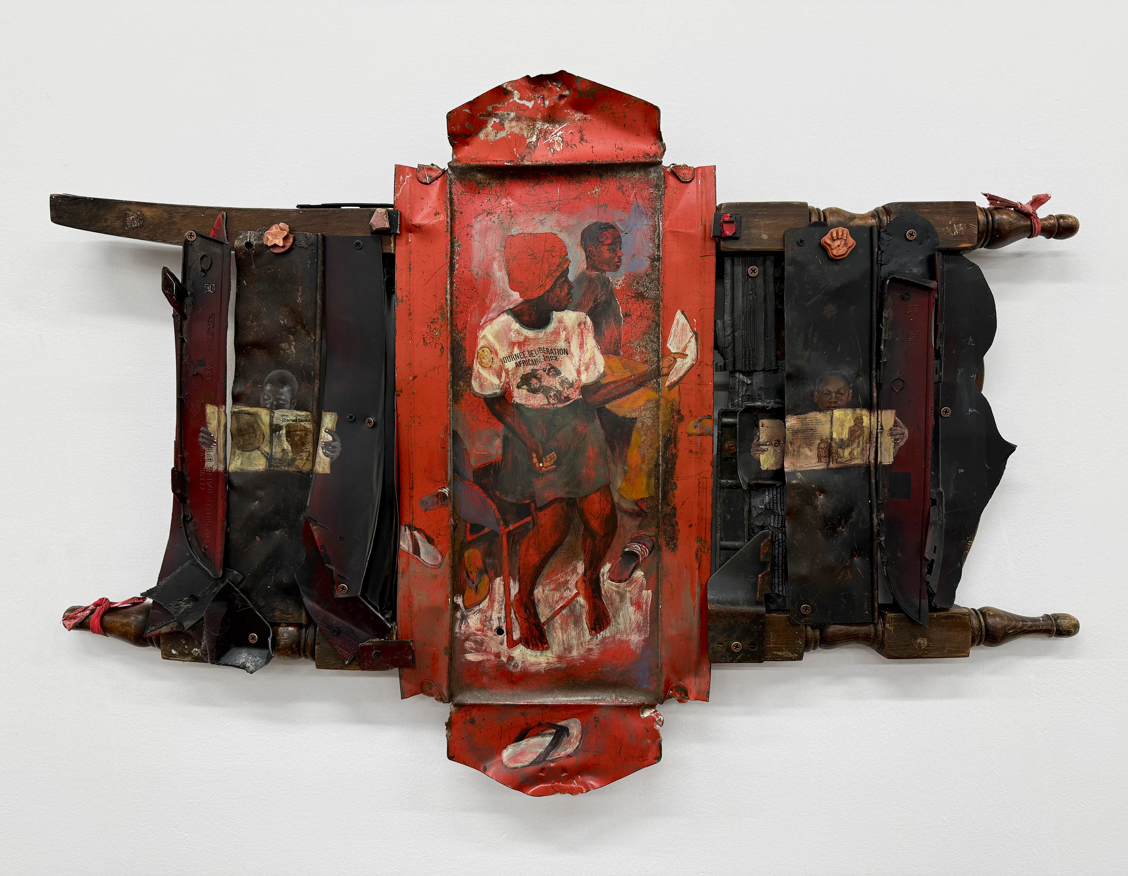 Young Pioneers (Centre Thomas Sankara pour la Libération et L’unité Africaine), 2025, Acrylic and found materials (metal, plastic, fabric, car parts, wooden chair, rubber stamps, tile, and other miscellaneous materials), 22 ½” x 33 ½ x 1.5 ½”