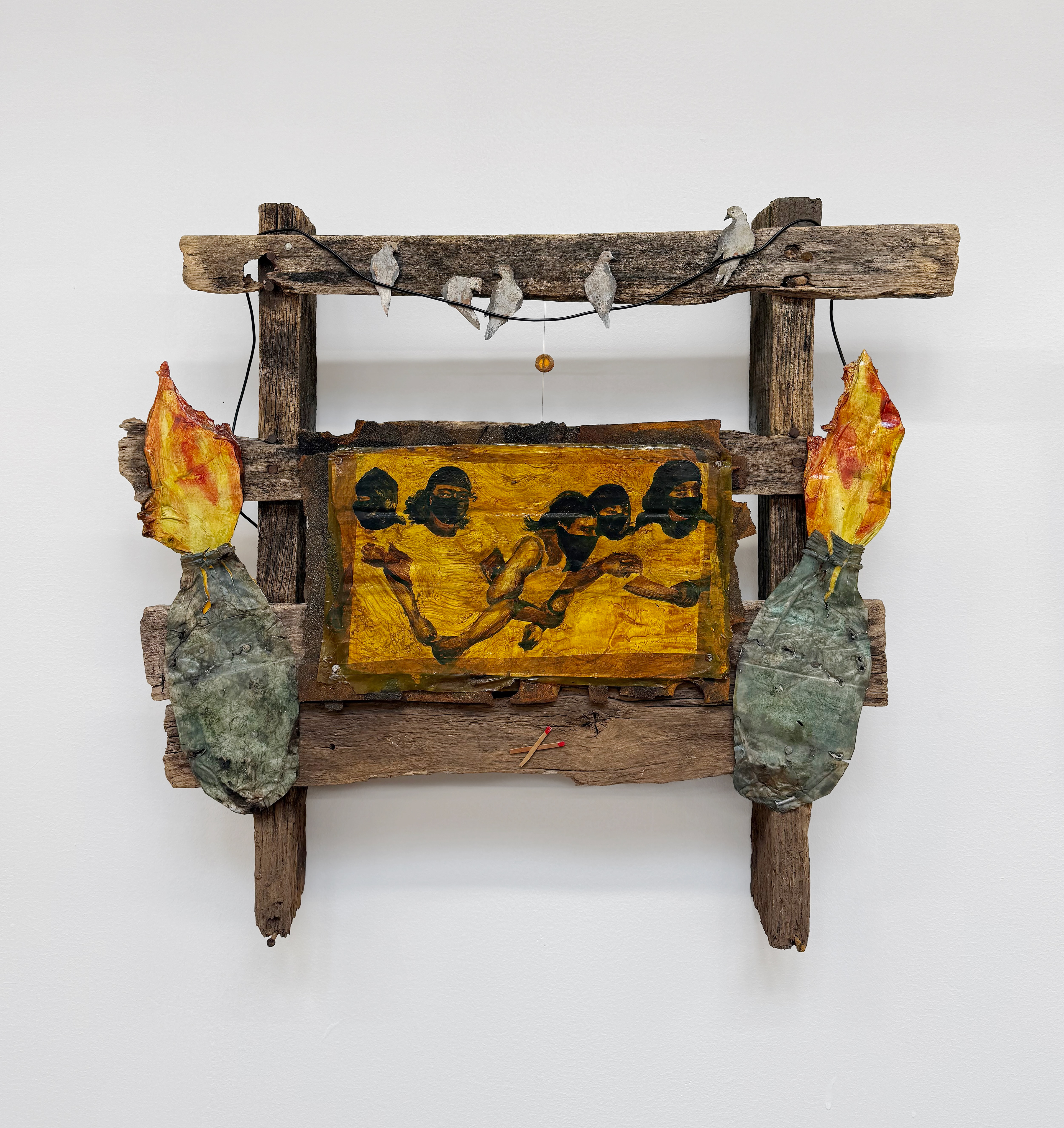 Masked Comrades (one), 2024, Acrylic and found debris (metal and plastic scraps, chain, fence post) 23 ¾” x 25 ¾” x 1 ¼”